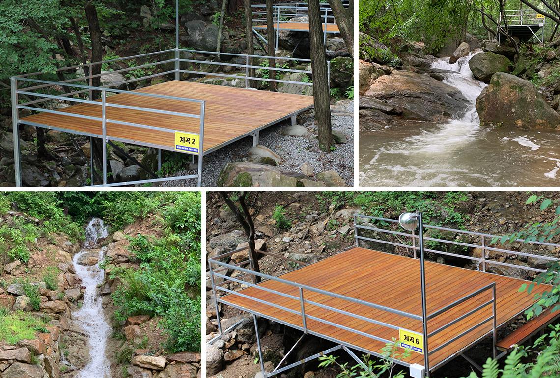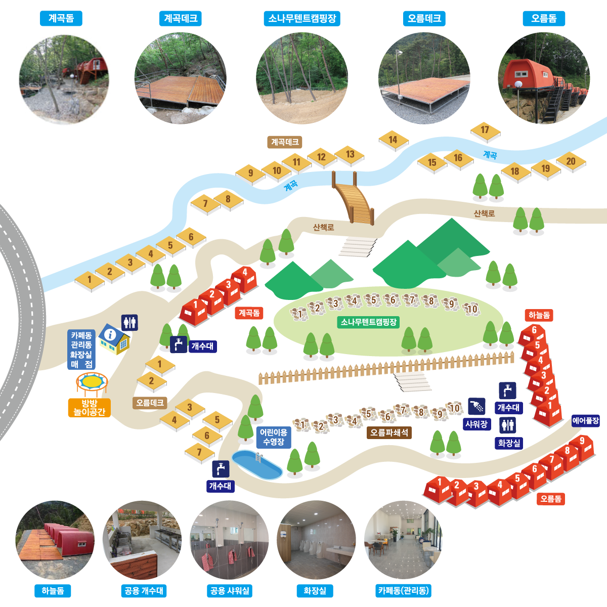 캠핑장 : 계곡데크 20 SET, 계곡돔 4 SET, 오름데크 7SET, 오름돔 9 SET, 하늘돔 6 SET, 소나무숲 10 SET, 오름파쇄석 10 SET